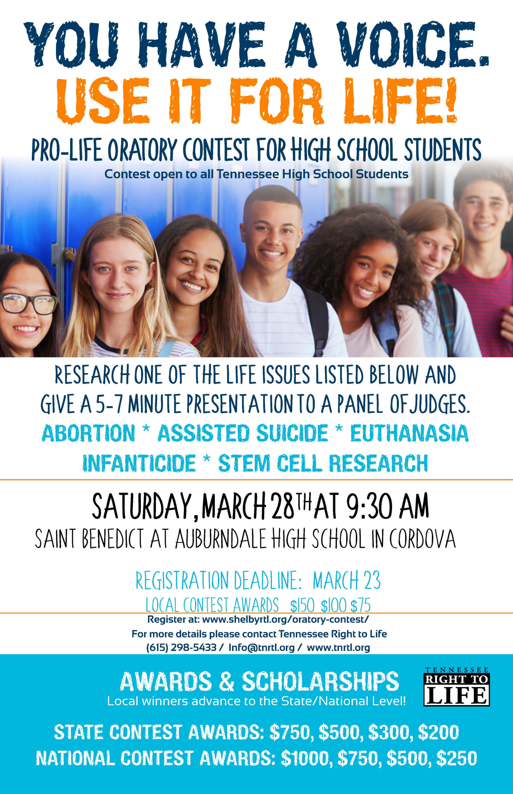 Shelby County Right to Life is excited to announce our upcoming Pro-Life Oratory Contest for High School Students! The contest is open to all Tennessee high school students, grades 9-12. Great prizes are awarded at each level of the competition!