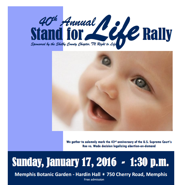 Join us for our 40th Annual Stand for Life Rally, January 17th. Our Keynote speaker will be Dr. Charles Fowler, Sr. Pastor at Germantown Baptist Church. We’ll also hear from a mother giving witness to her post-abortion healing and much more. The rally will be held at the beautiful Memphis Botanic Garden – Hardin Hall 750 Cherry Rd at 1:30PM…